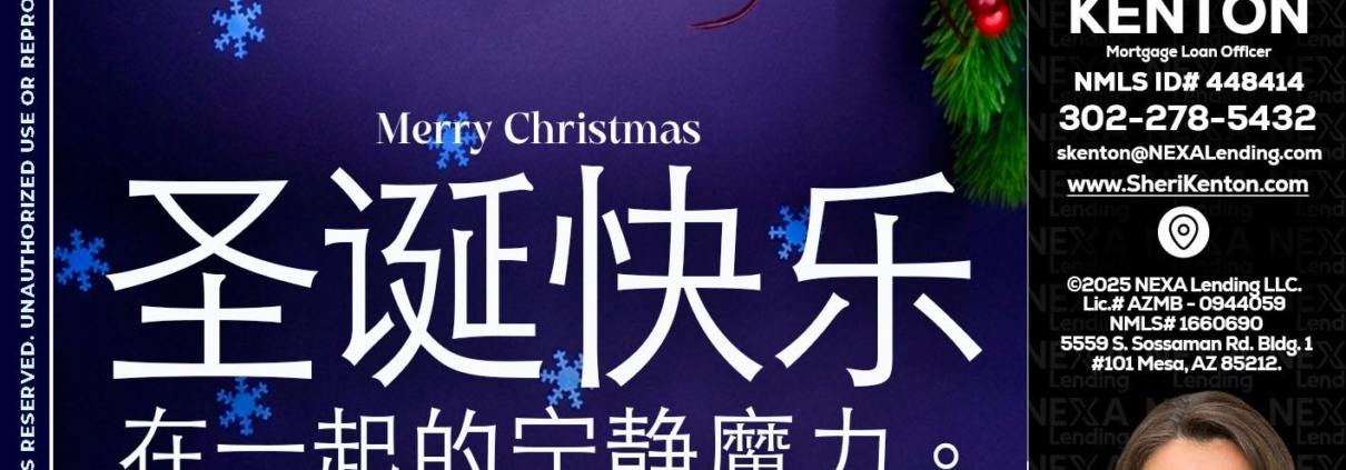 圣诞快乐 在一起的宁静魔力。 - Sheri Kenton -Mortgage Loan OfficerHi, my name is Sheri Kenton. I’m a Loan Officer with NEXA Lending LLC., offering personalized mortgage solutions, fast customized quotes, great rates and service with integrity.